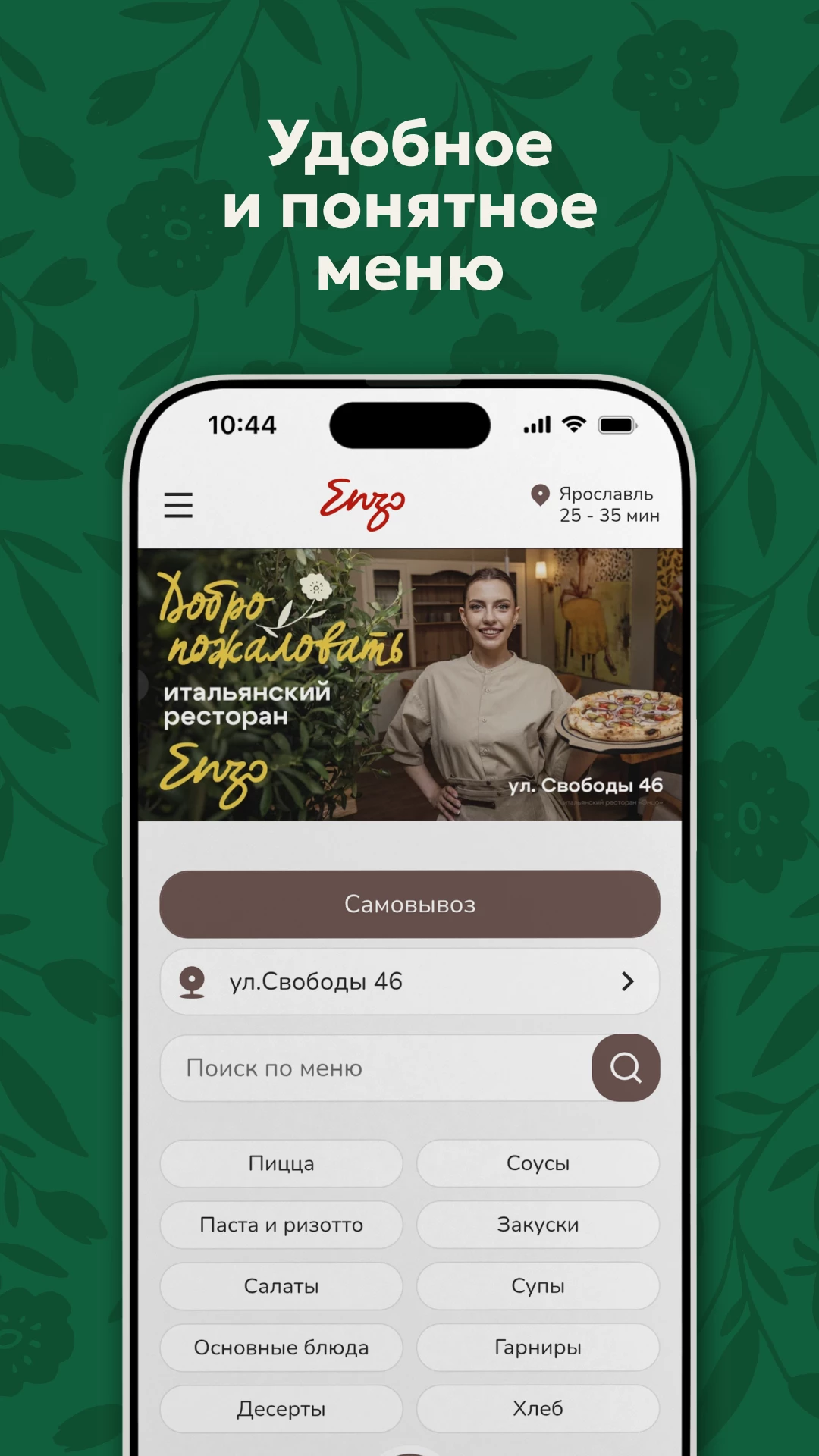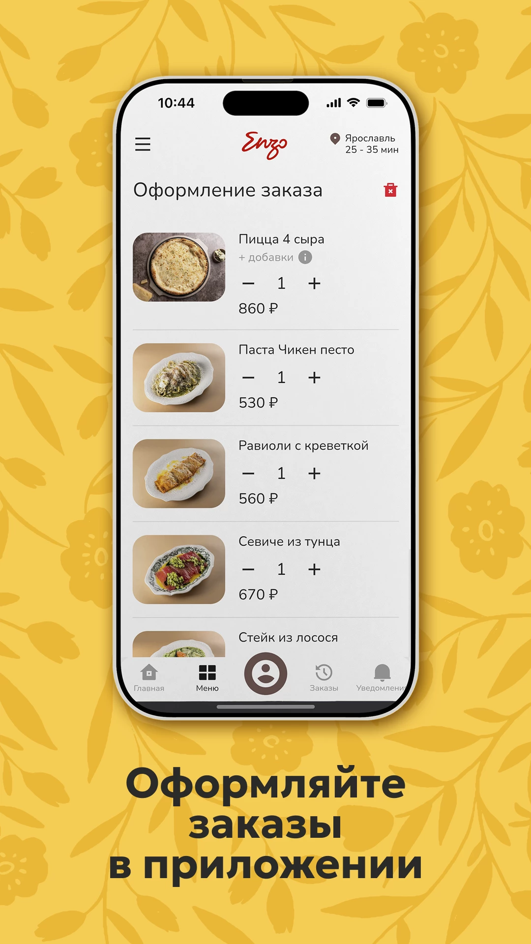 Приложение для заказа еды из ресторана Enzo в Ярославле С помощью нашего приложения Вы сможете быстро оформить заказ. Посмотреть количество доступных бонусов, отследить в личном кабинете статус заказа и отредактировать свой профиль.